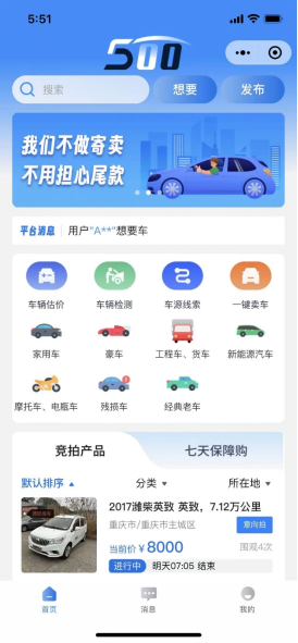 《500拍車》是一款為閑置二手車提供交易平臺(tái)的小程序,在500拍車小程序中,用戶可以設(shè)置自己關(guān)注的車輛類型,隨時(shí)隨地獲取最新的車輛消息推送;同時(shí)用戶可以自己成為獨(dú)立商家,發(fā)布自己的閑置二手車信息,供大家進(jìn)行競拍搶購;同時(shí)用戶通過小程序可以實(shí)現(xiàn)車輛估價(jià)功能,可以在賣車或者買車之前先了解相關(guān)車輛的價(jià)格信息,讓二手車的價(jià)格更加透明;同時(shí)小程序提供車輛檢測功能,隨時(shí)了解車輛的安全信息,防止二手車存在事故、火燒、水泡等安全風(fēng)險(xiǎn);同時(shí)用戶還可以在車源線索功能中了解到自己心儀車輛的相關(guān)信息;在雙方交易時(shí)采取雙方線下見面交易,不存在中間商賺差價(jià)的行為,這樣保證了二手車價(jià)格的公開透明性,也保證了雙方交易資金的安全,用優(yōu)質(zhì)的服務(wù)留住用戶,保證了小程序擁有穩(wěn)定的用戶群體,同時(shí)提升了小程序的口碑以及傳播度,為小程序長期發(fā)展打下堅(jiān)實(shí)基礎(chǔ)。