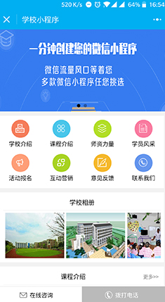 培訓教育行業可以算得上是比較賺錢的行業了,因為大家都知道無論是搞線下培訓還是線上培訓,只要你能獲得大量的培訓客戶,你必將賺錢,因為對培訓學校來說,培訓一個金額培訓十個都是一樣的。所以,培訓學校必將也會抓住現在的新潮-小程序開發。 成都小程序開發龍兵科技,最近開發的培訓學校小程序做了個培訓行業的通用解決方案。 打開培訓學校小程序的首頁可以看見,學校介紹、課程介紹、師資力...